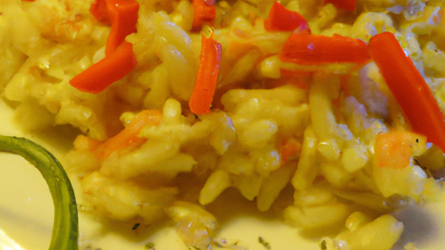 Risoto cuit a la facon d'un pilaf additionée de pistil de safran et de poivrons rouges cuits a l'huile d'olive
