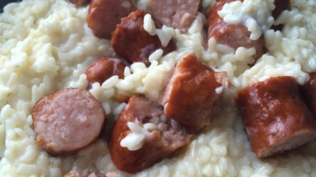 Lorsque la louche de bouillon a été absorber ajoutez en une autre, et ainsi de suite jusqu'à épuisement du liquide sans cesser de remuer. Pendant ce temps plongez les saucisses dans une casserole d'eau bouillante une dizaine de minutes.
