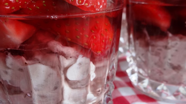Répartir le riz dans 4 beaux verres, répartir les morceaux de fraises par dessus puis verser la future gelée. Garder au froid au moins 2 heures, le temps que la gelée prenne. Avant de servir, laver les fraises restantes, les couper en 2 ou en 4 et les répartir sur les verres.