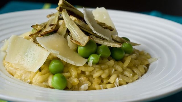 Quand le feu est coupé, ajouter le beurre, le mascarpone et les 80g de parmesan, sans mélanger. Couvrir et laisser 4-5minutes avant de dresser. Agrémentez avec petits pois, les artichauts et quelques copeaux de parmesan.