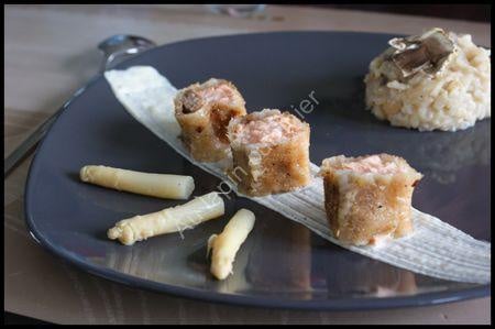 - 1Le risottoEplucher, ciseler l'échalote, la faire revenir quelques minutes dans un mélange beurre-huile, ajouter les asperges coupées en tronçons de 1 cm (les pointes sont conservées pour la décoration), saler et poivrer, réserver. Faire cuire le risotto dans 4 fois son volume d'eau bouillante, au cours de la cuisson, ajouter le mélange champignon-asperge. La cuisson dure environ 20 minutes, le riz ne doit pas être pâteux, le coeur encore légèrement croquant.