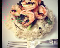 Disposer le risotto dans une assiette, ajouter les crevettes sur le dessus et décorer avec quelques feuilles de persil haché et les zestes du citron.