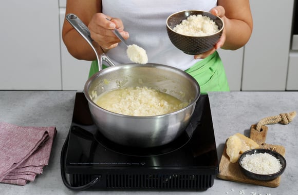 5Retirez la casserole du feu et ajoutez le parmesan râpé.