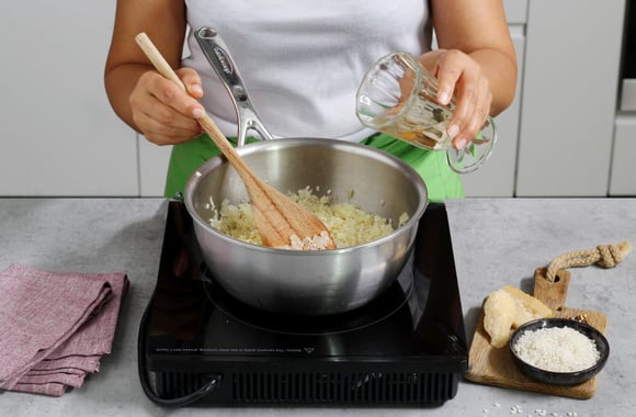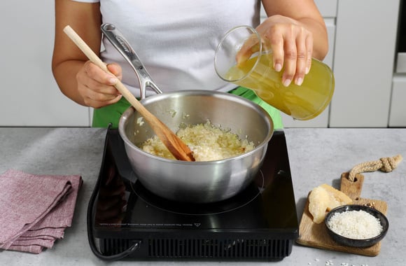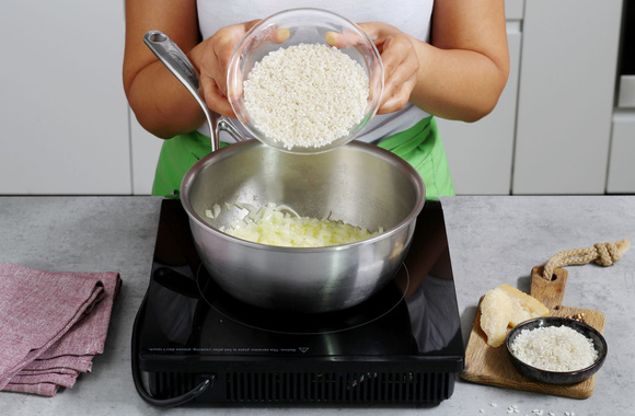 2Lorsque l’oignon devient transparent, ajoutez le riz et faites-le revenir jusqu’à ce qu’il devienne translucide.