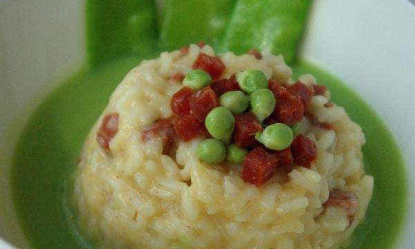 Déposer le risotto au fond d'un plat creux, entourer du velouté et décorer avec les pois et le chorizo restant.