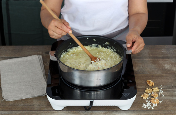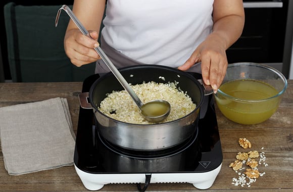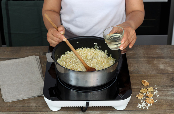 5Une fois que le vin blanc s'est presque évaporé, ajoutez une louche de bouillon de légumes tout en remuant pour que le riz ne s'accroche pas au fond de la casserole. Salez et poivrez.