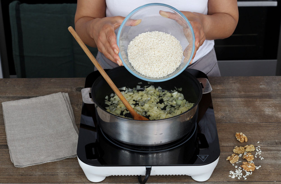 3Quand l'oignon est transparent, ajoutez le riz et faites-le revenir jusqu'à ce qu'il devienne translucide.