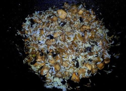 Ajoutez le riz, les olives noires dénoyautées et le poulet à vos oignons qui ont du suer. Remuez continuellement. - 2