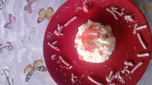 Quand les allumettes de jambon sont dorés , mettez-les dans le risotto. Coupez les tomates en morceaux versez les dans la casserole.