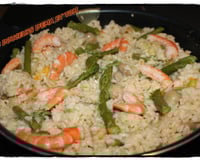 - 3Lorsque le riz est cuit, rajoutez la crème fraîche puis les crevettes et les asperges.Dégustez.