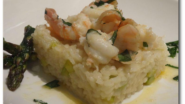 Faire chauffer 2 c à s d'huile d'olive dans une sauteuse. Faire suer l'oignon. Ajouter le riz arborio, mélanger jusqu'à ce qu'il devienne transparent. Verser le vin blanc, laisser évaporer.
