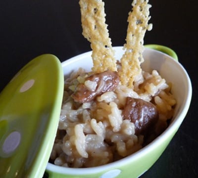 Versez ensuite 1/4 du bouillon, les cèpes ré-hydratés (selon mode d'emploi du produit), salez, poivrez et laisser cuire à feu doux jusqu'à absorption complète du liquide en remuant régulièrement, puis rajoutez à nouveau 1/4 du bouillon... et répétez l'opération jusqu'à complète cuisson du riz.