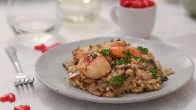 Transférez le risotto dans une grande assiette de service, ajoutez les noix de Saint-Jacques par dessus.