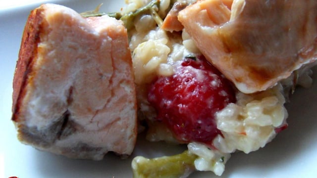 L'idée m'est venue sur le marché en voyant les têtes d'asperges que nous avait amené le maraîcher, elles étaient fermes, brillantes, l'idée du risotto m'est venue de suite. Et dans mon frigo, il y avait ces nouveaux carrés frais au poivre et baies roses et je me suis dit on met de la crème en fin de risotto et pourquoi pas un carré frais ! Ben je peux vous dire que c'est super ! Aa apporte le crémeux nécessaire à un bon risotto, la saveur de ces carrés frais s'est super bien marié aux fraises, très subtile la saveur baies roses. Je l'ai servi avec des dés de saumon.