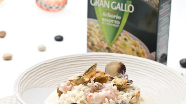 Lorsque le riz est cuit, ajoutez le parmesan râpé et la crème fraîche, mélangez bien pour obtenir un risotto bien crémeux. Ajoutez enfin les fruits de mer et servez aussitôt.