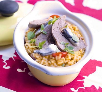 Retirer l'oignon cuit du bouillon. Dans une sauteuse, le faire revenir avec le riz dans l'huile d'olive en remuant à la spatule en bois jusqu'à ce que le riz devienne transparent. Verser ensuite le bouillon chaud petit à petit, deux louches à la fois en attendant qu'il soit presque tout absorbé avant d'en remettre, laisser cuire environ 20 minutes selon son goût : al dente ou plus crémeux. Rajouter les tomates coupées en deux à mi-cuisson. A la fin, rajouter le parmesan et saler si nécessaire, déposer sur le dessus les demi-langues et les anchois en éventail. Déchirer le basilic à la main, en parsemer le risotto. Poivrer et servir dans la sauteuse.