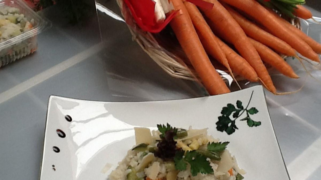 Attendre l'absorption totale du vin avant de continuer en ajoutant peu à peu le bouillon de la même façon, une petite quantité à la fois. Lorsque le riz est cuit, ajouter les légumes, mélanger, poivrer, couvrir 2 minutes. Servir avec le parmesan puis décorer l'assiette.