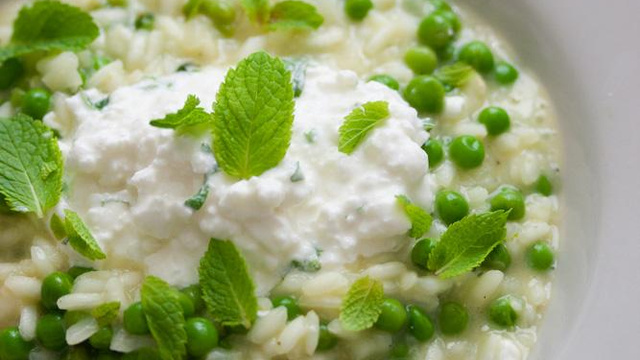 Servez le risotto dans des assiettes creuses, surmontez d'une cuillère de cottage cheese à la menthe. Ajoutez quelques petites feuilles de menthe fraîche.