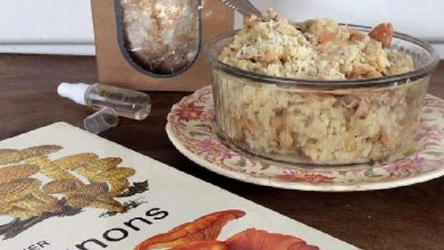Éplucher et émincer finement l'oignon, puis le faire revenir dans une poêle avec un filet d'huile d'olive. Trancher les pleurotes en deux ou trois et les ajouter à l'oignon, une fois celui-ci bien doré.