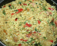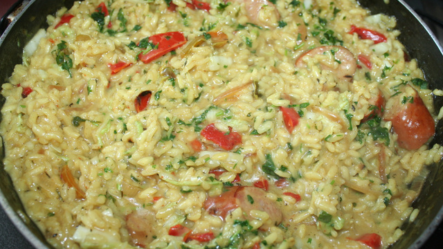 un risotto fait d'une manière classique mais comme s'il venait de Thailande ! un régal pour les papilles, qui conviendra aux végétariens mais auquel on peut selon son désir, ajouter des brochettes d'agneau ou des saucisses, comme ici.