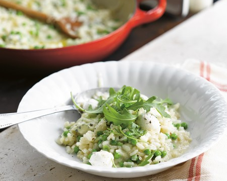 Après 15 min, ajoutez les petits pois. Continuez à remuer et à ajouter du bouillon.