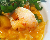 C'est une base de risotto classique cuit au fond blanc dans lequel on ajoutera des dès de courge butternut juste snacké, le risotto sera lié au dernier moment au lait de coco et un peu d'orange sanguine pour apporté le peps nécessaire.