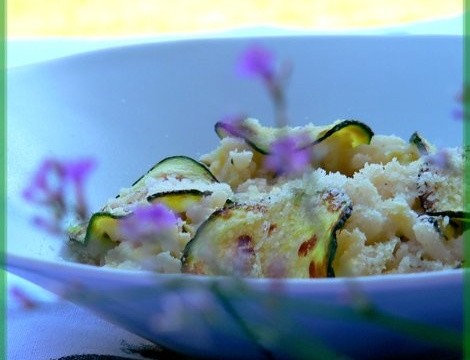 Ajoutez les courgettes râpées et décorez avec les courgettes lamelles.