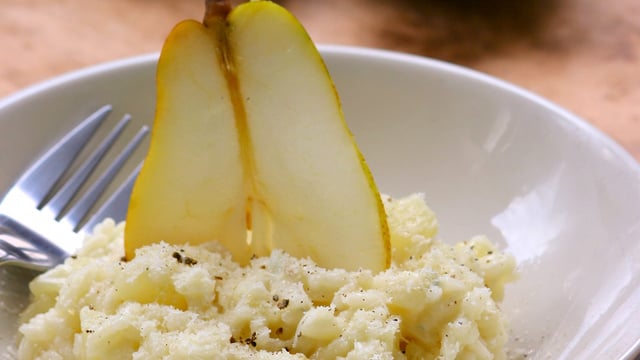 Quelques minutes avant la fin de la cuisson, ajoutez le dés de bleu et de poire au risotto et remuez délicatement, jusqu'à ce que le fromage fonde. - 4