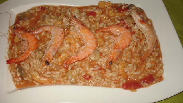 Ajouter le vin blanc puis petit à petit le bouillon de volaille chaud en remuant. Une fois le riz cuit, ajouter la préparation crevettes, champignons, tomates. Décorer avec les crevettes entières.