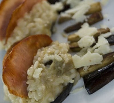 dresser deux tranches d'aubergines dans une assiette, recouvrez de deux cuillerées de risotto et décorez d'une tranche de bacon, vous pouvez décorer également de copeaux de cantal !
