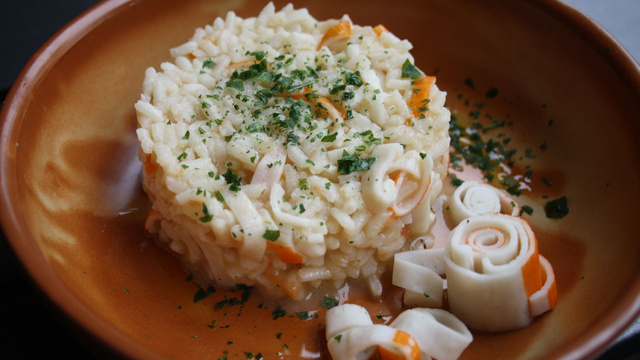 Transvasez le risotto dans une grande assiette creuse de service, servez-le aussitôt, chaud.
