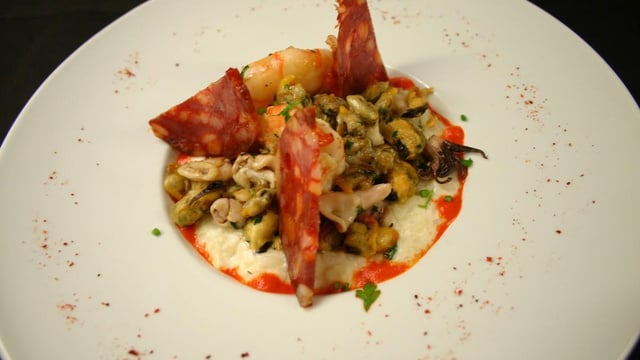 Dressez dans le fond des assiettes le risotto, ajoutez le coulis de poivrons puis les fruits de mer, ajoutez le chorizo.