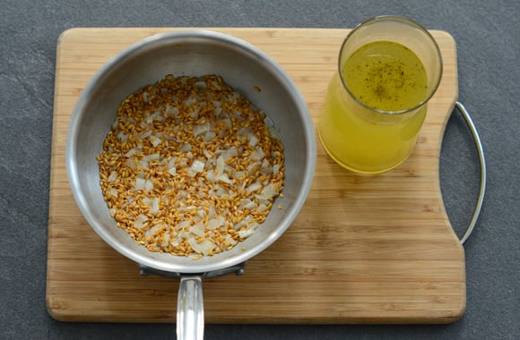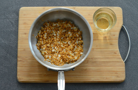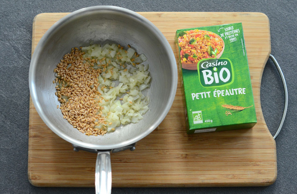3Quand l’oignon est transparent, ajoutez le petit épeautre, et faites-le revenir 2 minutes.