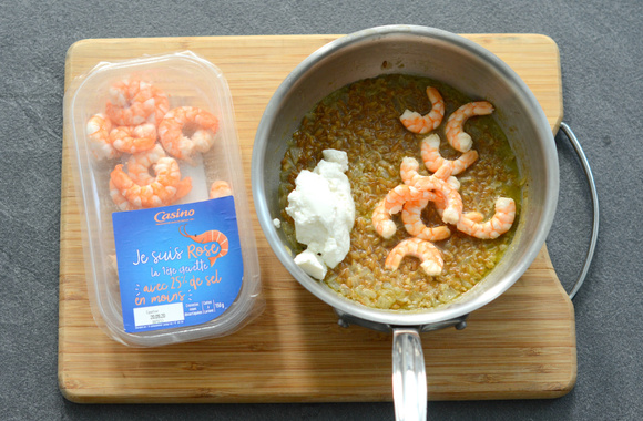 6Ajoutez les crevettes et le ricotta. Mélangez.