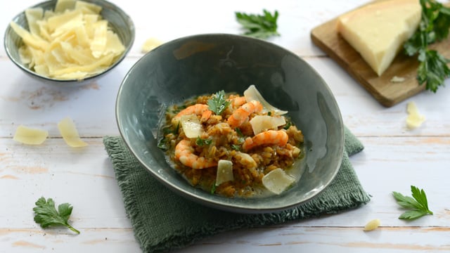 L'originalité de cette recette va plaire à tout le monde car on pense rarement à cuisiner le petit épeautre en mode risotto. Ici, il est associé aux champignons et aux crevettes ce qui va lui donner encore plus de saveurs.