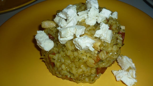 Avant de servir, rajoutez quelques dés de fromage de chèvre sur le dessus du risotto.