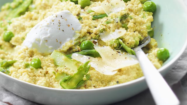 Hors du feu, incorporez petit à petit la pyramide Chavroux® et remuez délicatement le quinoa afin de la faire fondre. Assaisonnez selon votre goût et servez aussitôt. Vous pouvez agrémenter le risotto de quelques copeaux de parmesan.