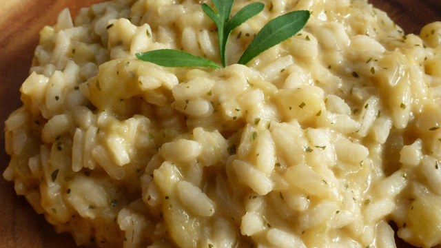 Faites revenir un peu pour dessécher la pulpe, puis ajoutez le riz. Faites revenir pour bien enrober le riz de gras, puis ajoutez le bouillon louche après louche, en remuant très régulièrement, jusqu'à ce qu'il soit cuit (18 min environ).
