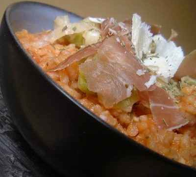 Servir le risotto avec le poireau et le jambon coupé en lanière