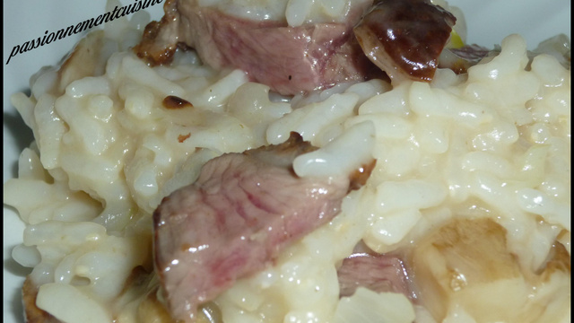 Lorsque la cuisson du risotto est terminé ouvrez la cocotte ajouter le beurre et le parmesan bien mélanger puis ajouter les cèpes et les morceaux de magret, mélanger de nouveau et servir.