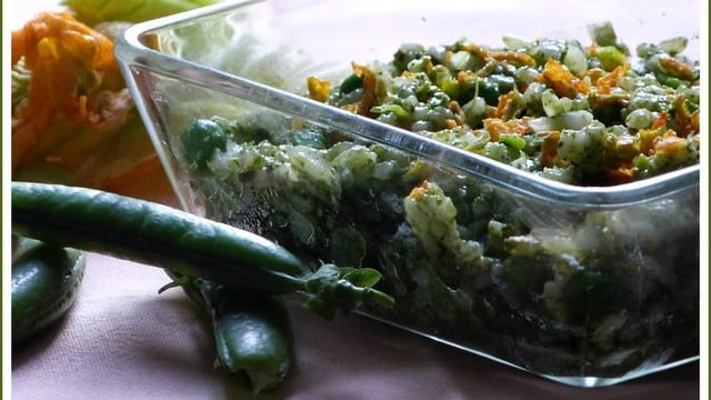 Pour apporter un peu de bonne humeur sur votre table, rien ne vaut un risotto aux couleurs du printemps, très tonique, goûteux et original : VERT et ORANGE !Si comme moi, vous n'arrivez pas à vous résoudre à jeter de superbes fanes de radis et de navets, vertes et fraîches, voici une façon sympathique de les utiliser.VERT ... des petits pois frais délicieusement sucrés, des fanes de navets à la saveur douce et délicate et des fanes de radis au goût frais et légèrement poivré ... ORANGE ... des fleurs de courgettes à la saveur fruitée d'abricot mûr.