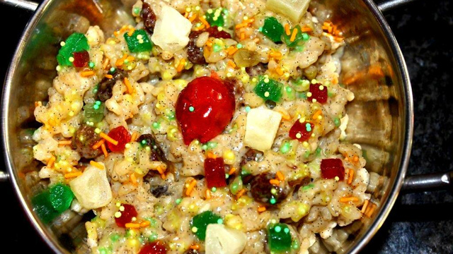 Laissez refroidir et ajoutez les raisins, dressez votre préparation dans votre plat et décorez avec des fruits confits et des paillettes colorées.