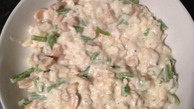 Ajouter le vin et laisser réduire. Ajouter ensuite le bouillon petit à petit. Au 3/4 de la cuisson (cuisson complète 20 à 25 minutes) ajouter les haricots En fin de cuisson, ajouter le parmesan , sel et poivre.
