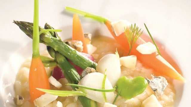 Riz Arborio cuit dans un bouillon de poule, lié au Chavignol affiné accompagné de légumes printaniers (pointes d'asperges vertes, carottes fanes, radis roses).
