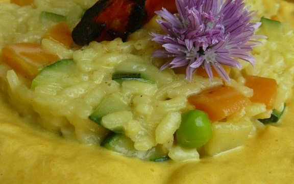 Une crème douce aux carottes et épices, un risotto aux légumes de printemps croquant et du curcuma pour colorer et relever le tout.