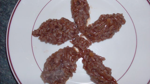 Lorsque tout le bouillon a été absorbé, y ajouter les verres de vin rouge et un peu de crème liquide pour les gourmands. Mettre du gruyère râpé...