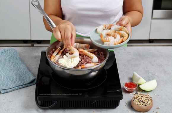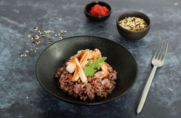 Un risotto original, à base d'un trio de riz dont le riz noir Venere. Un mariage parfait et raffiné avec les langoustines.