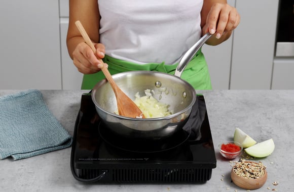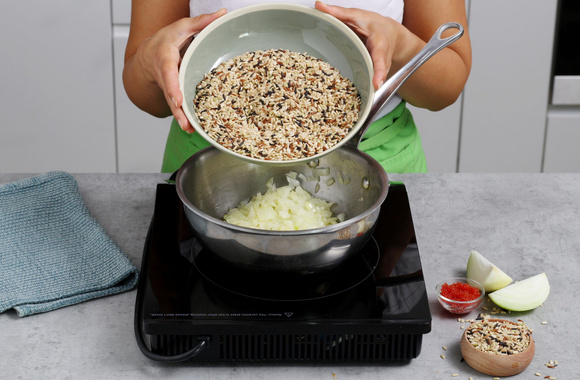 3Quand l’oignon est transparent, ajoutez le riz, et faites-le revenir jusqu’à ce qu’il devienne translucide.