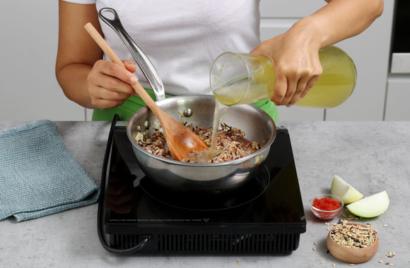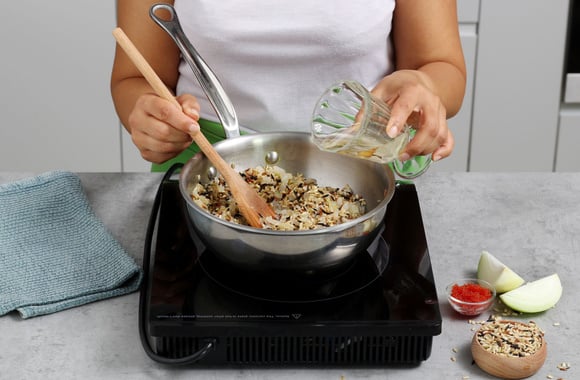 5Une fois que le vin blanc s’est presque évaporé, ajoutez une louche de bouillon tout en remuant pour que le riz ne s’accroche pas au fond de la casserole. Salez et poivrez.