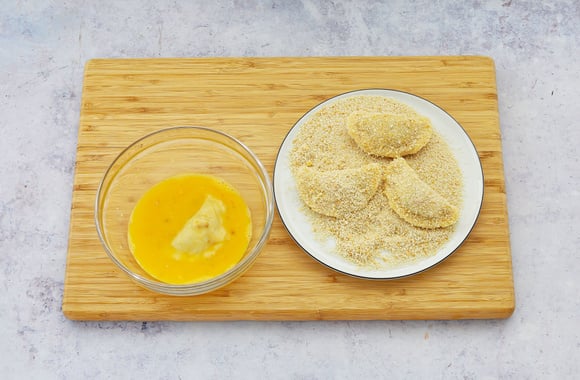 Trempez les chaussons dans l'œuf battu puis dans la chapelure afin de les paner.